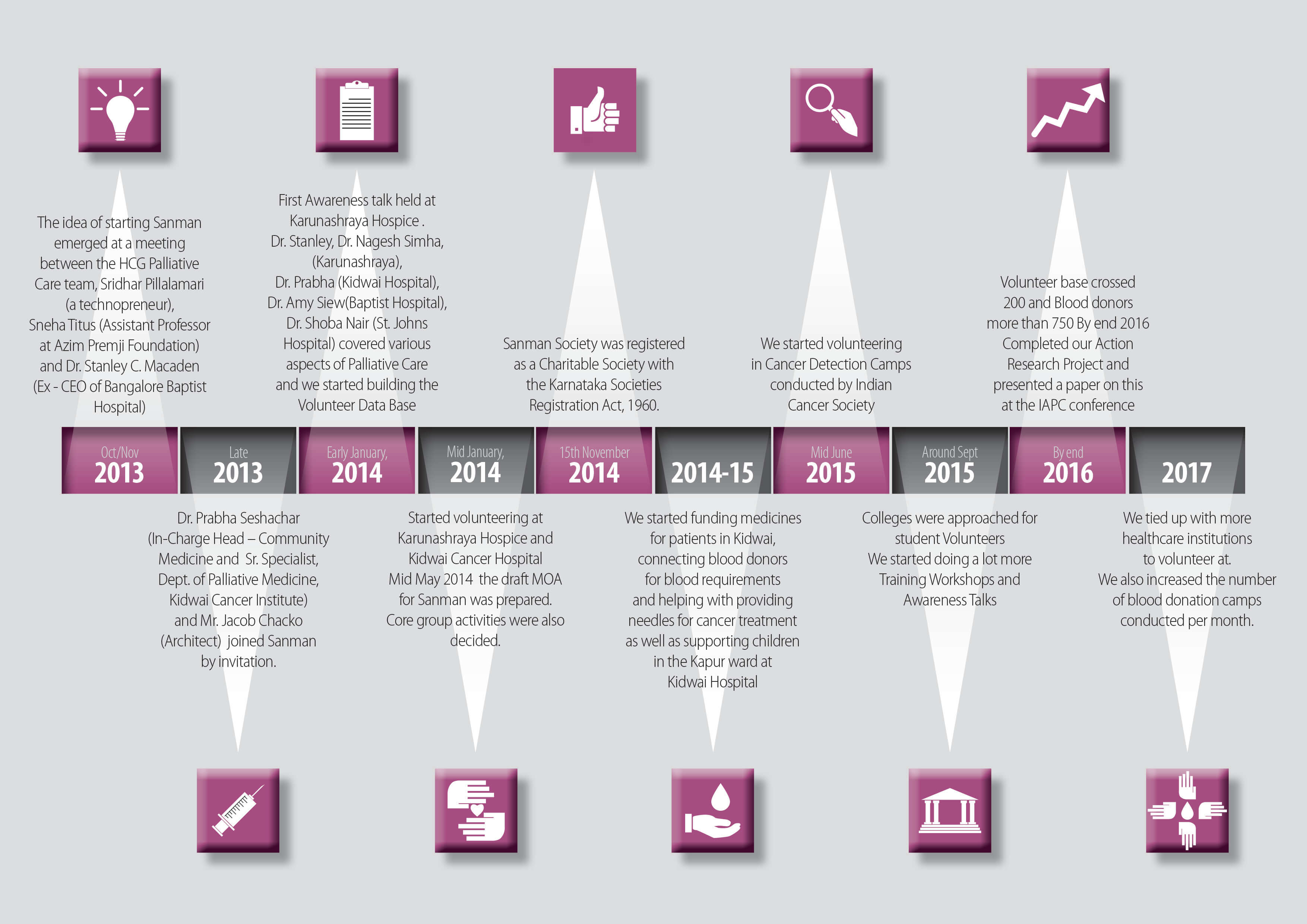 Sanman (roughly translated to mean ‘respect’) is a growing network of individuals and professionals in Bangalore who offer their services voluntarily to provide support and help to the existing network of palliative care organizations and also to assist families and patients for curative, palliative and end-of-life care. This is a free, voluntary service. Sanman is based in Bangalore.
